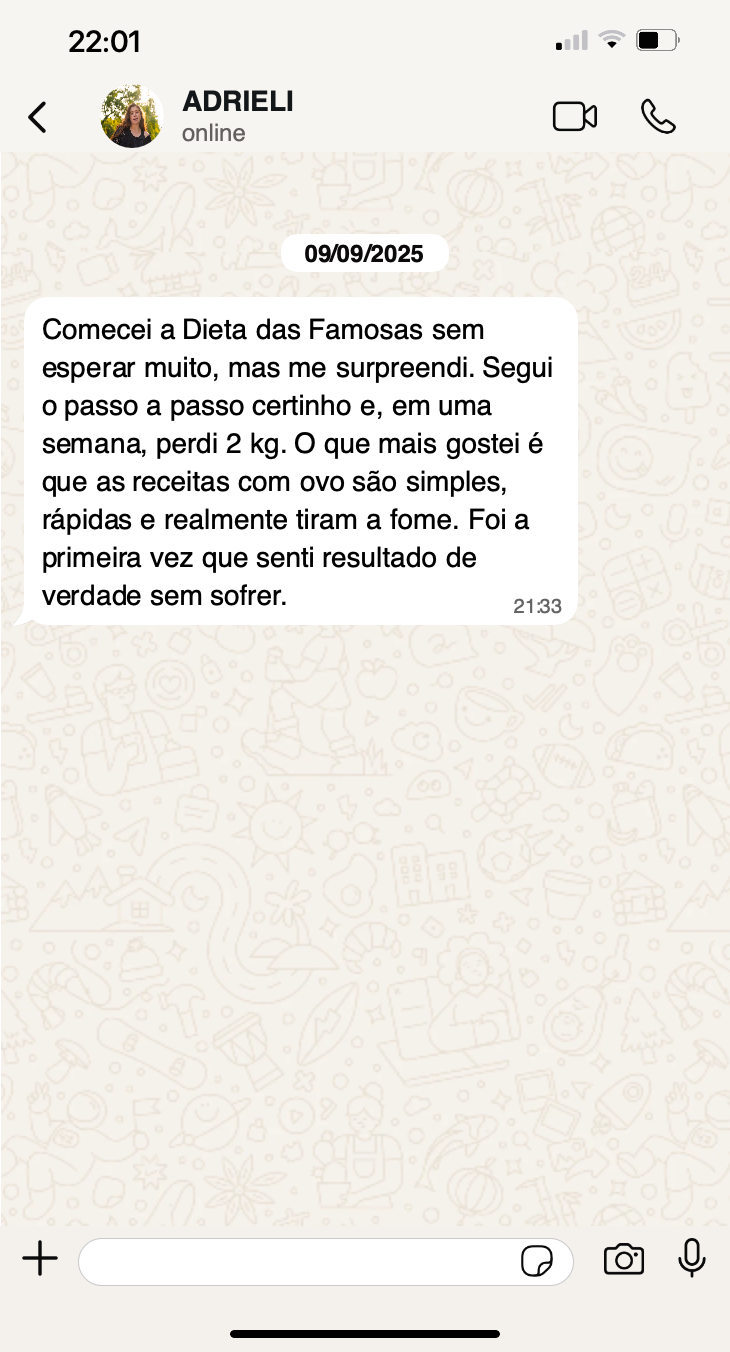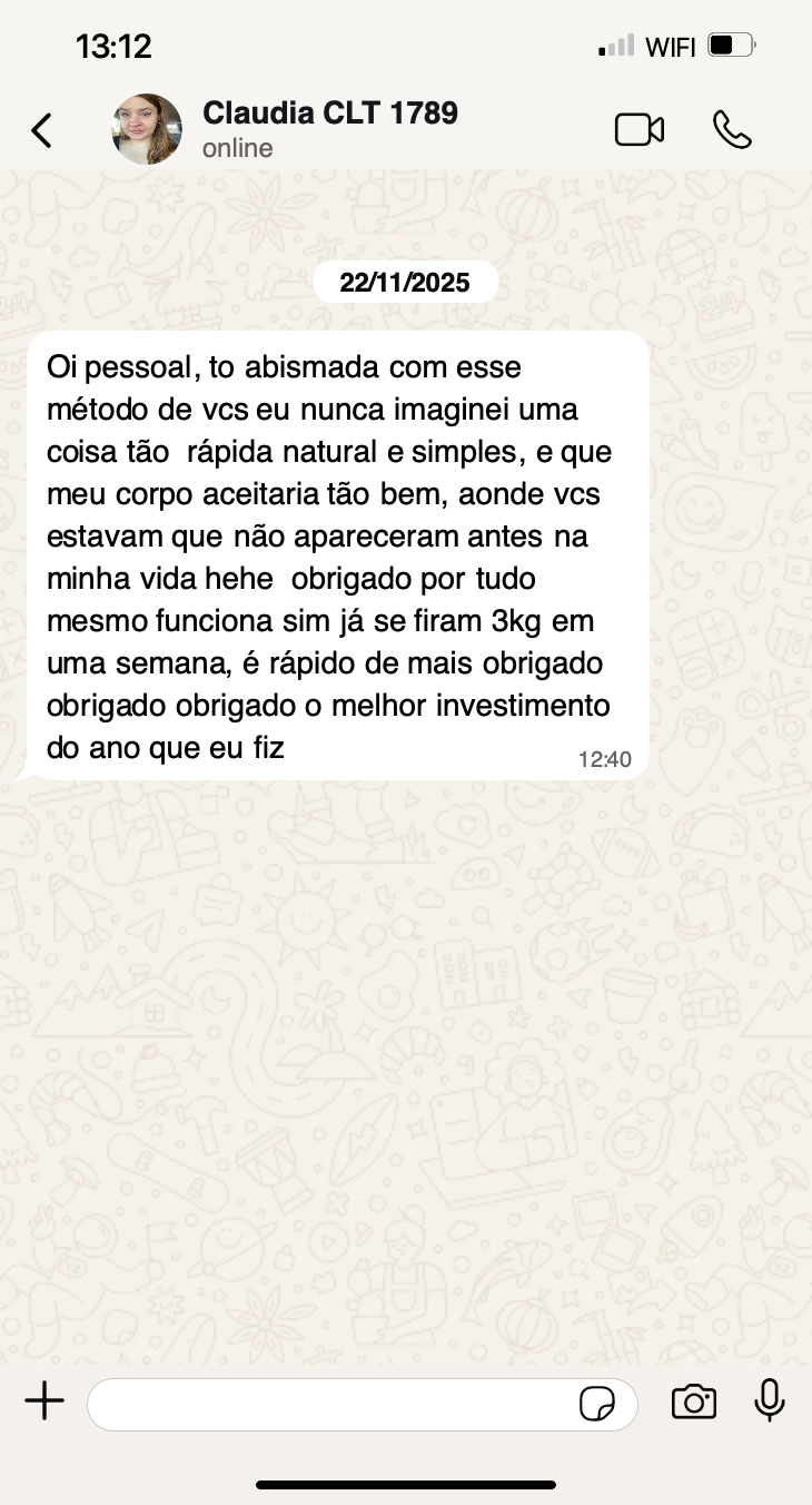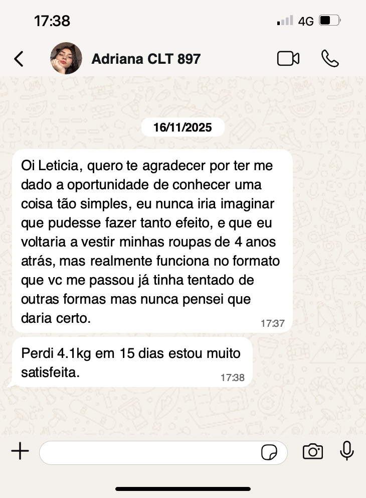 "Olá! Eu precisava compartilhar a minha experiência com a Fórmula das Famosas, porque sinceramente… eu estou chocada com os resultados. Desde que comecei a seguir o método, tudo mudou. Minha energia aumentou, aquela vontade de comer besteira sumiu, e o melhor de tudo: finalmente estou eliminando aquelas gordurinhas teimosas que nunca saíam por nada.